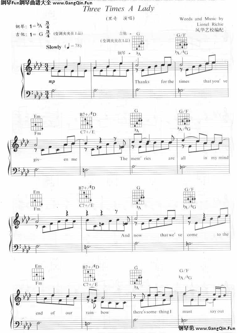 鋼琴演奏樂譜《Three Times A Lady-萊昂內爾-裡奇(線譜)》(鋼琴圖譜6張)
