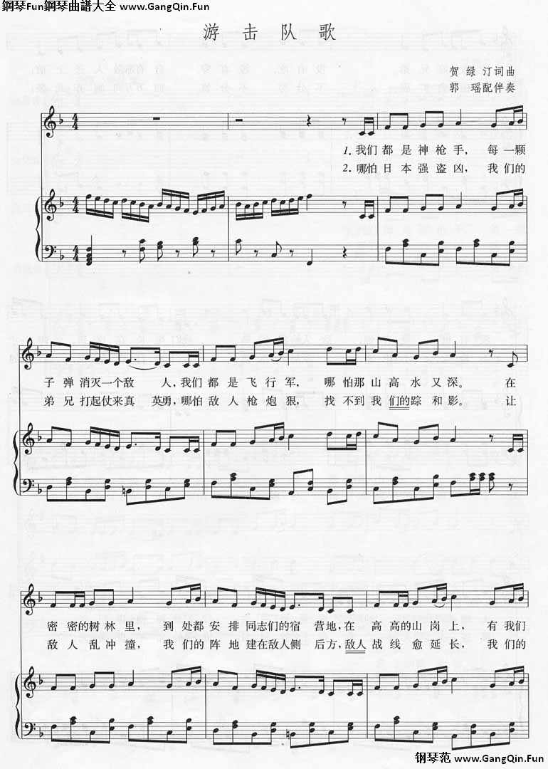 鋼琴演奏樂譜《游擊隊歌-鋼琴伴奏(線譜)[不同版本]》(共2張鋼琴譜)