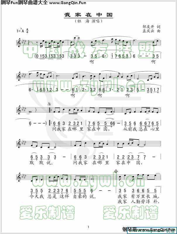 祖海《我家在中國(彈唱譜)》(鋼琴譜共5張)