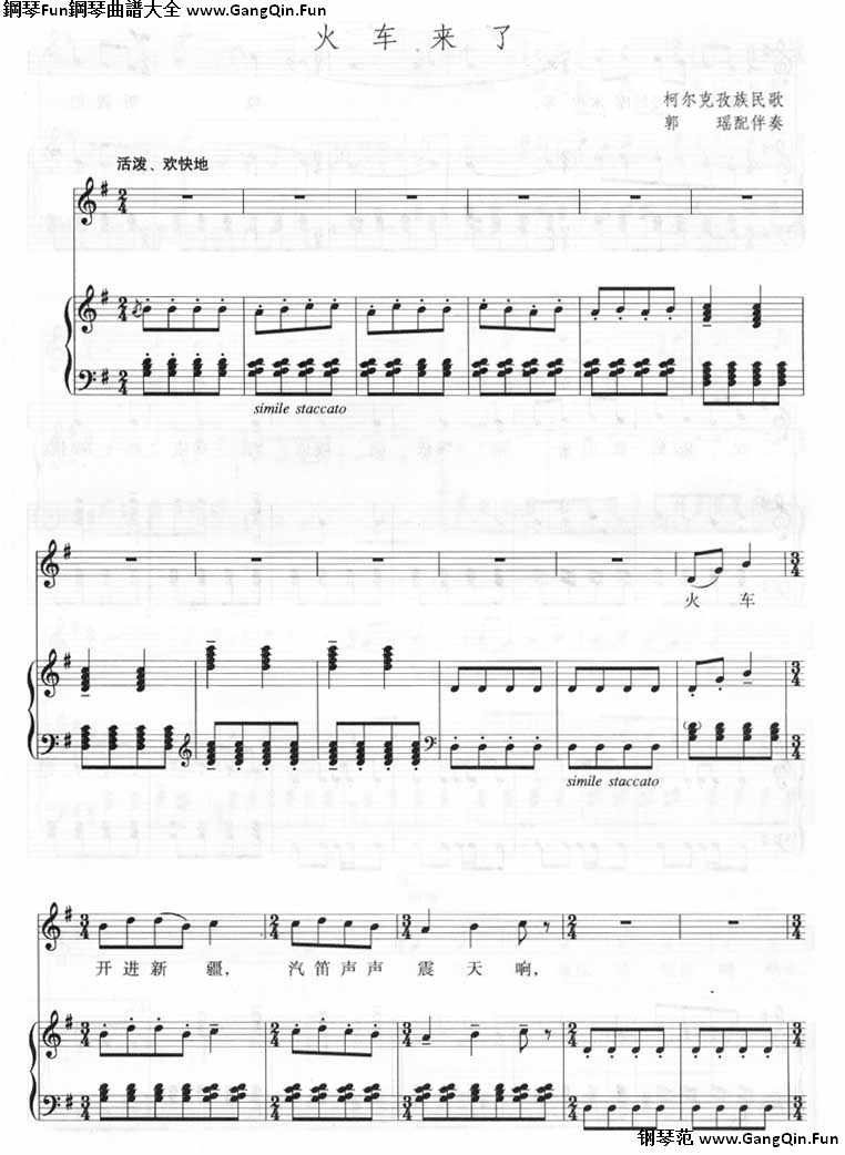 鋼琴演奏樂譜《火車來了-柯爾克孜族民歌(線譜)》鋼琴曲譜(共3張)